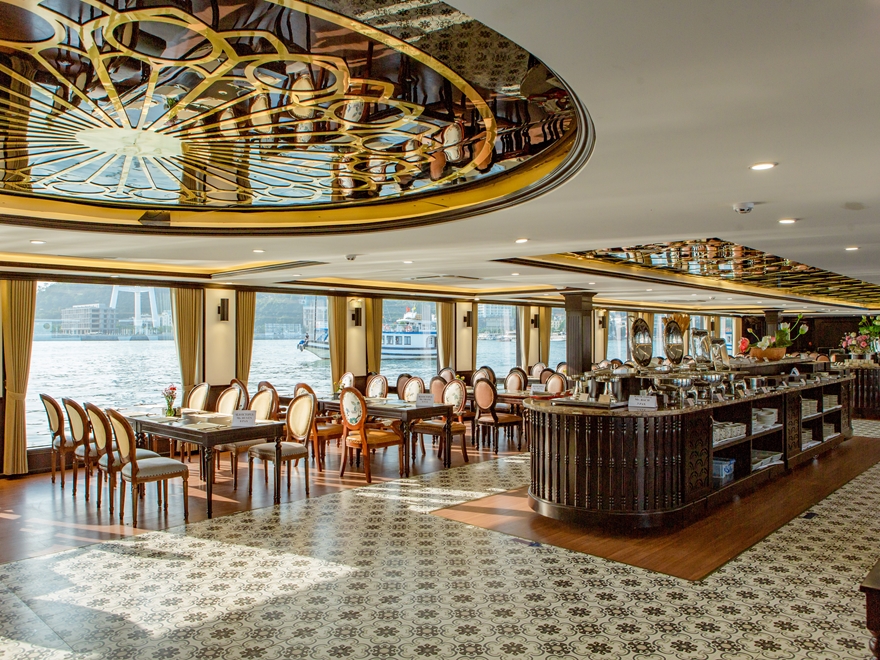 12:00 - 13:00 Thưởng thức buffet trên du thuyền - đại tiệc Buffet với hơn 60 món ăn Âu - Á và đặc sản địa phương.