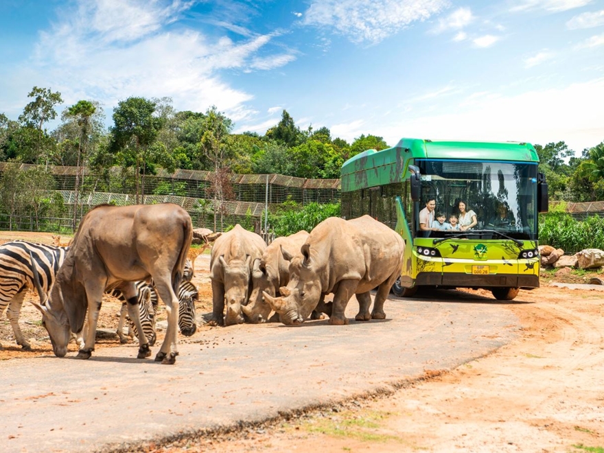 - Điểm nhấn độc đáo nhất tại Vinpearl Safari chính là Tour bán hoang dã – “Nhốt người thả thú”. Bạn sẽ được ngồi trong xe buýt chuyên dụng an toàn, di chuyển qua những khu vực nơi hươu cao cổ, sư tử, ngựa vằn, tê giác… tự do dạo bước quanh xe. Trải nghiệm cận cảnh này mang lại cảm giác phấn khích, hồi hộp nhưng vẫn rất an toàn và đáng nhớ cho cả trẻ nhỏ lẫn người lớn.