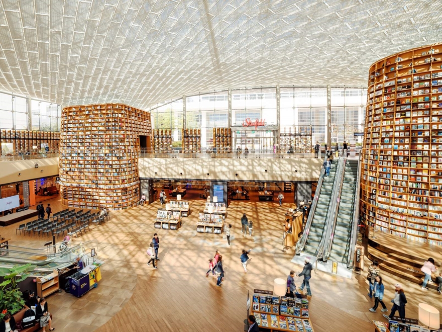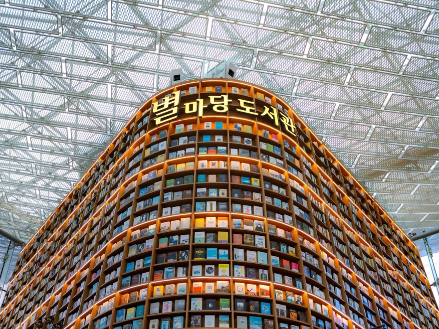 - Di chuyển đến Starfield Library Suwon, thư viện nổi tiếng nằm trong trung tâm thương mại Starfield Suwon Mall, check-in không gian ấn tượng với các kệ sách cao đến 22m.