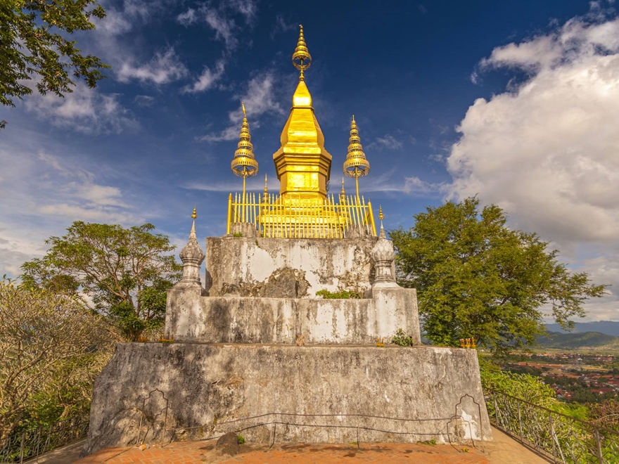 khách sạn, xe đưa đoàn chinh phục đỉnh nhà cố đô Phousi, ngắm cảnh bình