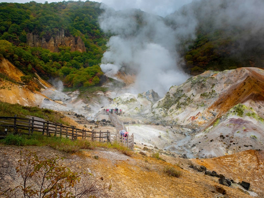 - Tham quan thung lũng Jigokudani tại Noboribetsu, nổi tiếng với suối nước nóng, khói lưu huỳnh bốc lên giữa khung cảnh rừng nguyên sinh hoang sơ