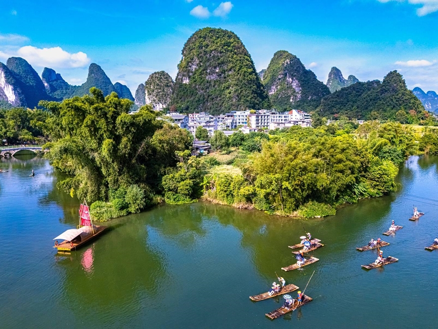 • Trải nghiệm chèo bè tre trên sông Yulong, len lỏi giữa núi đá vôi, cánh đồng và làng quê yên bình, cảm nhận không gian tĩnh lặng và thư thái.