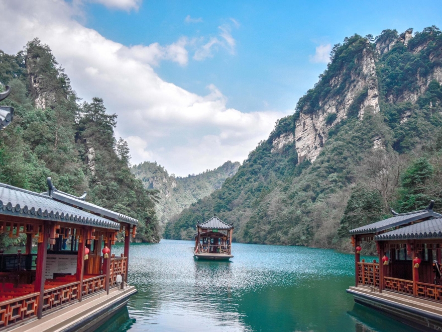 • Ngồi thuyền tham quan Hồ Bảo Phong, mặt hồ xanh trong thuộc khu thắng cảnh Vũ Lăng Nguyên, từng là bối cảnh phim Tây Du Ký