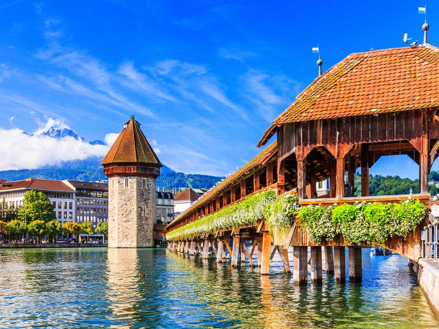 - Tham quan Lucerne cổ kính, chiêm ngưỡng Cầu Chapel – cây cầu gỗ có mái che cổ nhất châu Âu, biểu tượng của Thụy Sỹ.