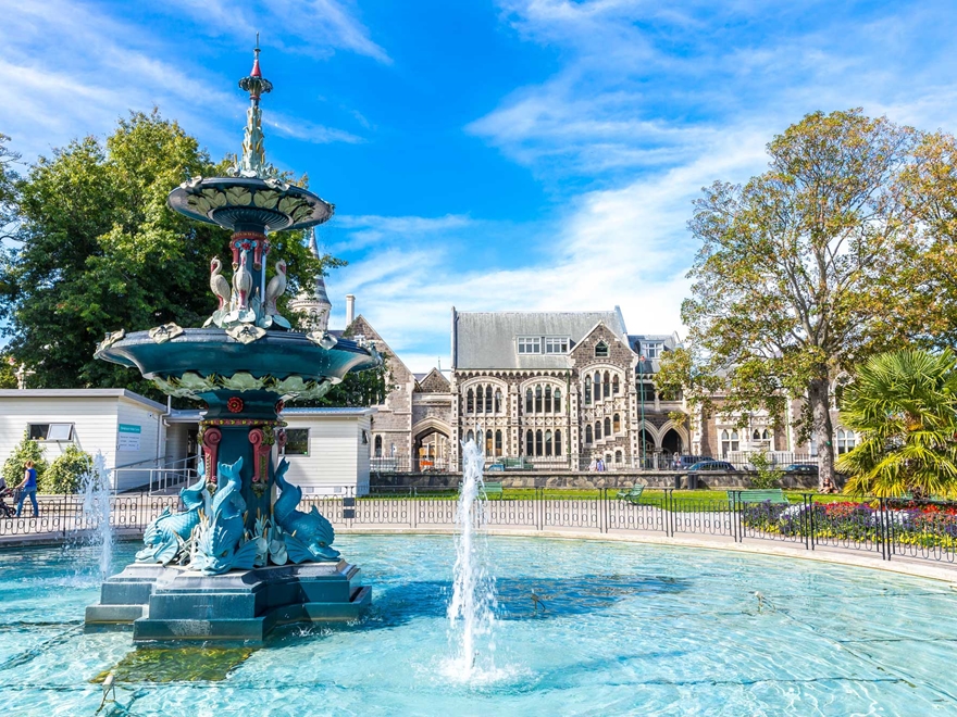 Xe đưa đoàn ra sân bay đáp chuyến bay đi Christchurch. Khám phá thành phố hoa cỏ Christchurch – “khu vườn khổng lồ” của New Zealand.