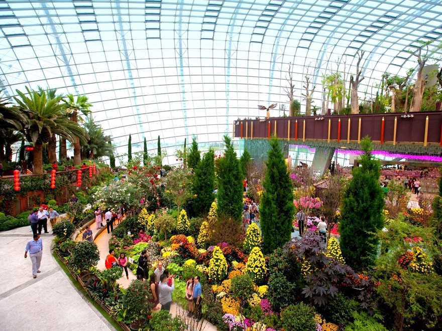- Khám phá Flower Dome, nhà kính hoa quy mô lớn với phong cách vườn quốc tế.
